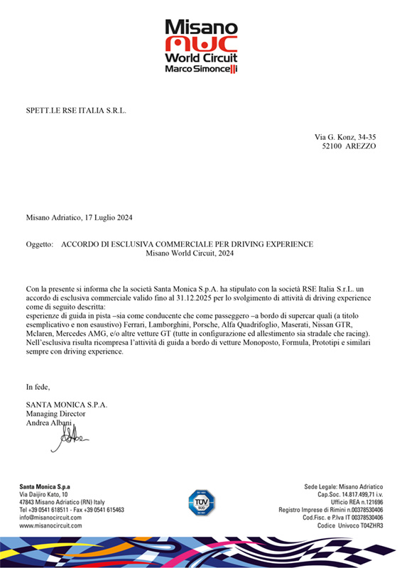RSE Italia è l’unica società autorizzata ad organizzare e vendere esperienze di guida nell’autodromo di Misano con le più belle supercar al Mondo quali Ferrari, Lamborghini, Porsche, Mclaren, Maserati, Audi R8, RS6, Mclaren, Alfa Quadrifoglio, Nissan GT-R, Mercedes AMG ed altre GT.
